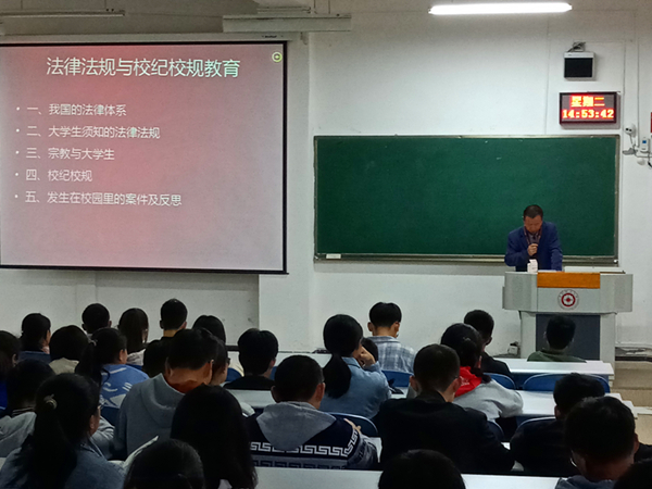 朱吉韬副书记则通过大量例子向同学们详细的介绍了有关法律法规与校纪校规的知识,主要包括了我国的法律体系,老员工须知的法律法规,校纪校规等。