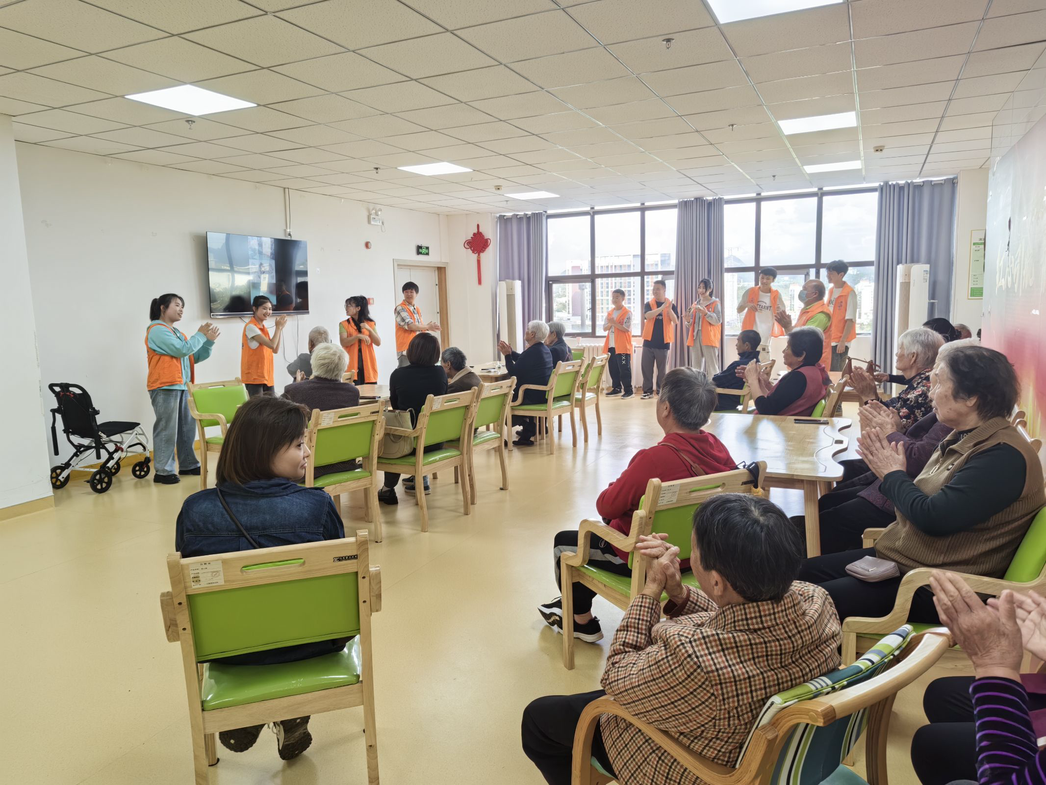 志愿者们准备了丰富多样的活动,既有精心编排节目表演,也有健康知识宣讲,现场欢声笑语不断,气氛温馨而热烈。接着,志愿者们还分组进行打扫卫生,经过地面清扫、物品整理、窗户擦拭和公共设施清洁,整个敬老院焕然一新,增添了更多的温暖。