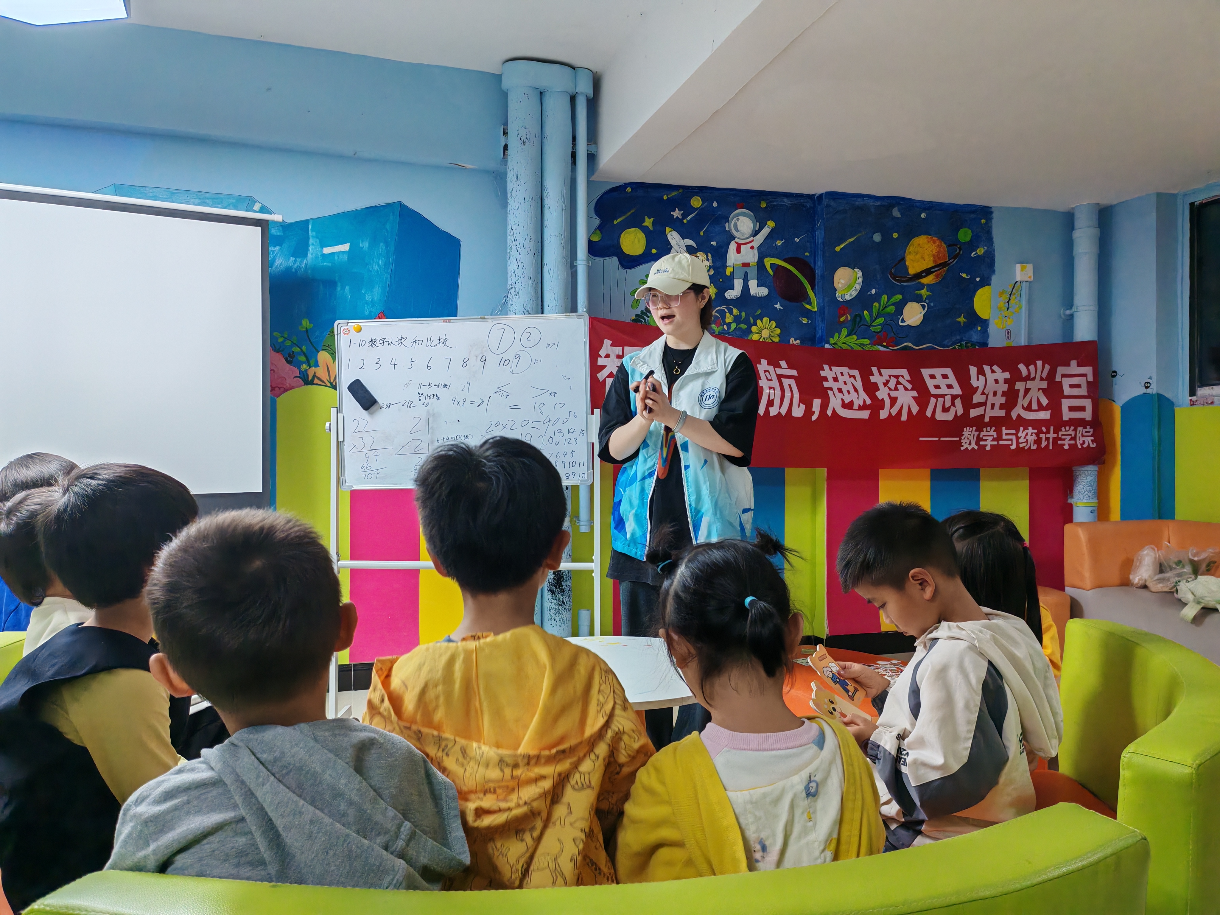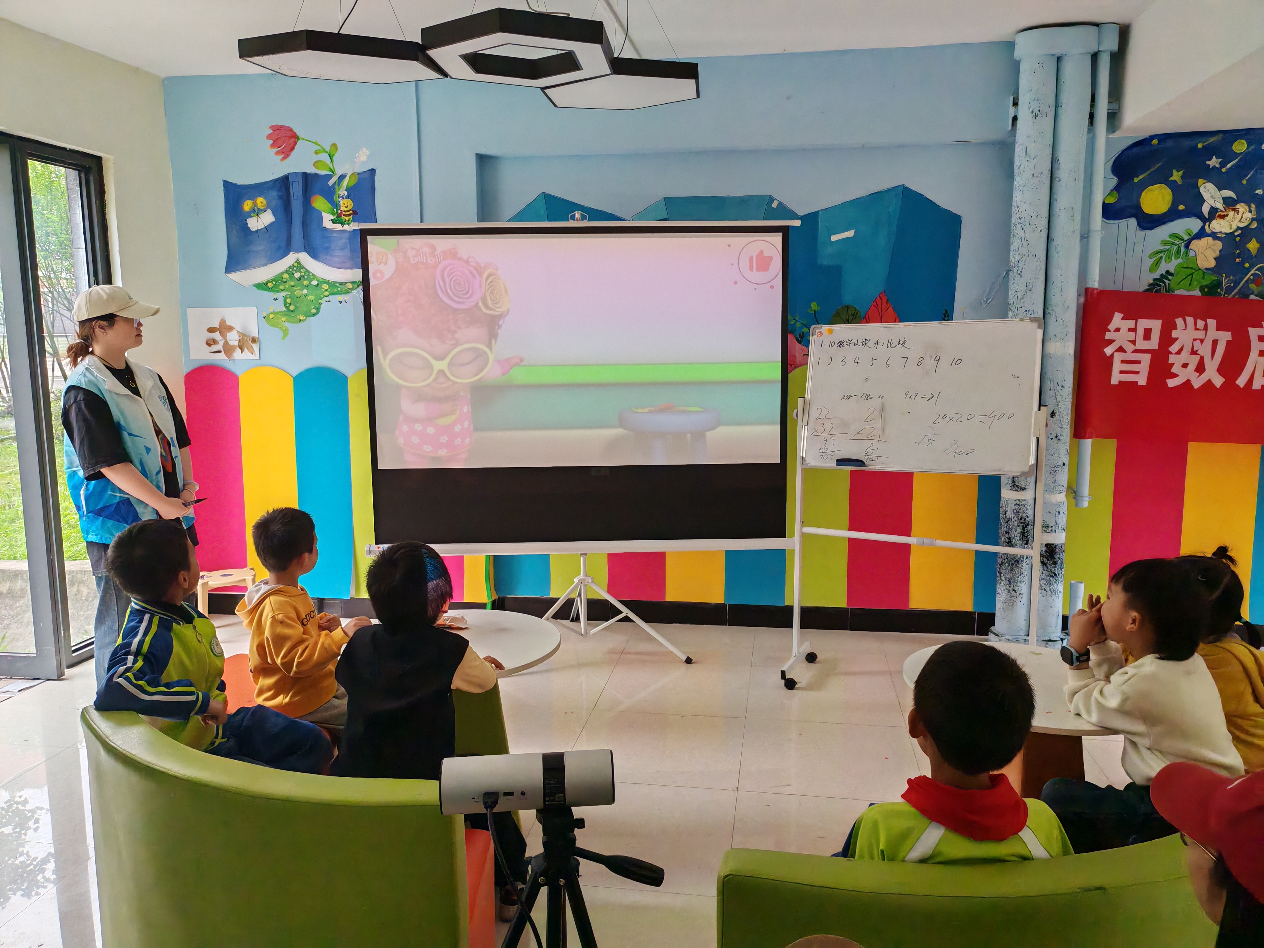 课堂上,志愿者们通过视频引导小朋友认识数字1 - 10,随后以“猜圆圈”游戏巩固认知。在数量比较学习中,视频教学结合卡牌游戏,让小朋友直观感受数量差异。最后,“找规律”抽卡牌游戏将课堂氛围推向高潮,小朋友在欢乐中完成知识学习。