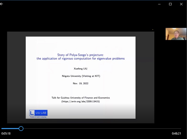 11月19日,威廉希尔williamhill邀请日本新潟大学刘雪峰副教授在线上腾讯会议作讲座。刘雪峰教授为公司师生作题为“从Polya-Szego关于多边形区域的特征值优化问题的猜想谈起--关于特征值问题的严格计算和应用”的学术讲座。公司师生代表40余人参与此次讲座。