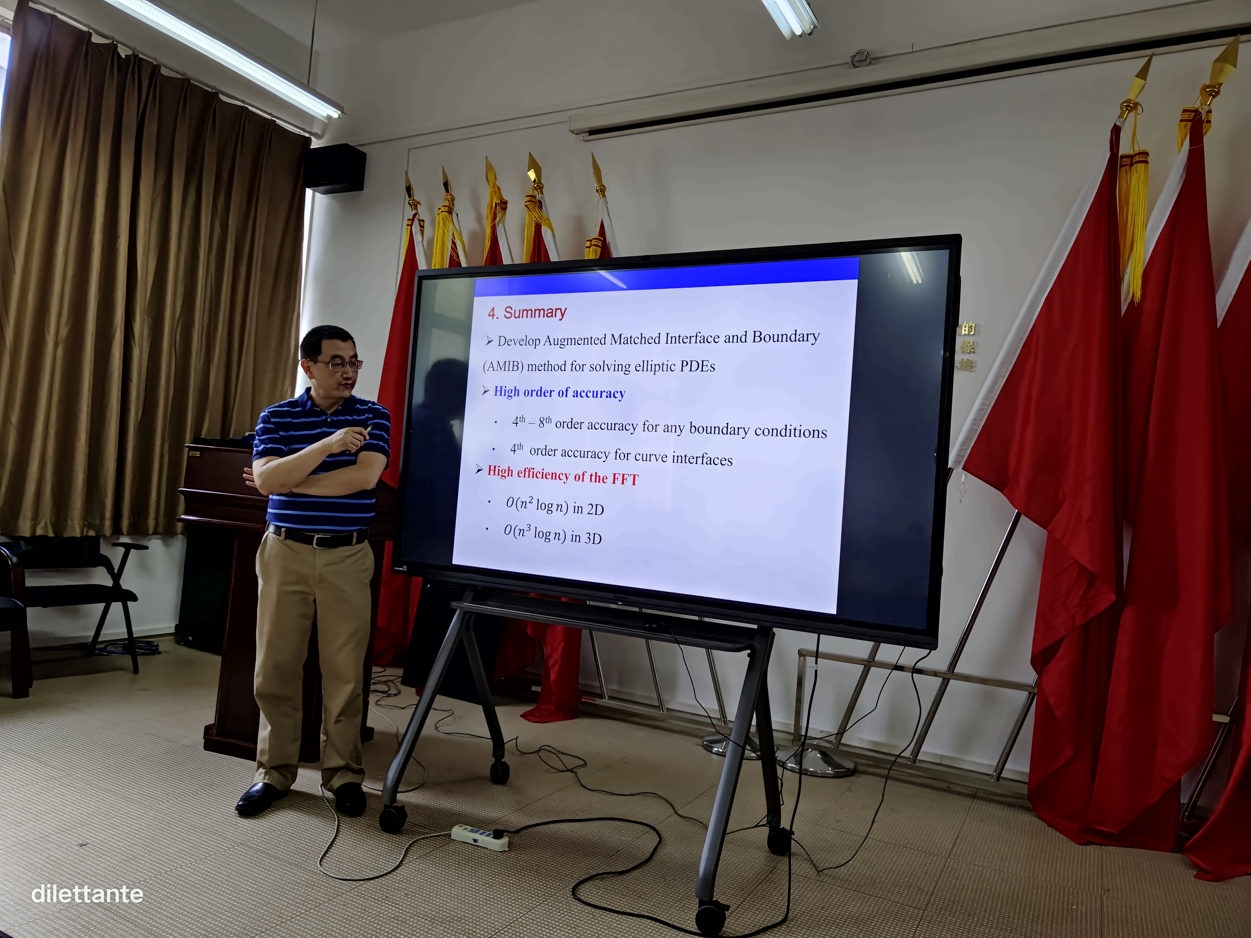 在讲座中,赵山教授介绍了一种增广复合界面与边界(Augmented Matched Interface and Boundary)方法用于解决椭圆方程界面问题。AMIB方法适应不同类型的边界条件,如Dirichlet、Neumann、Robin和它们的混合类型。在数值测试中,FFT-AMIB不仅在处理界面与边界时实现了四阶收敛且对于二维和三维的情形,其计算复杂度分别为O(n^2logn)和O(n^3logn),其中n表示为每个笛卡尔方向上的网格点数量。此外,AMIB方法也提供了解的梯度和通量的四阶精确近似。