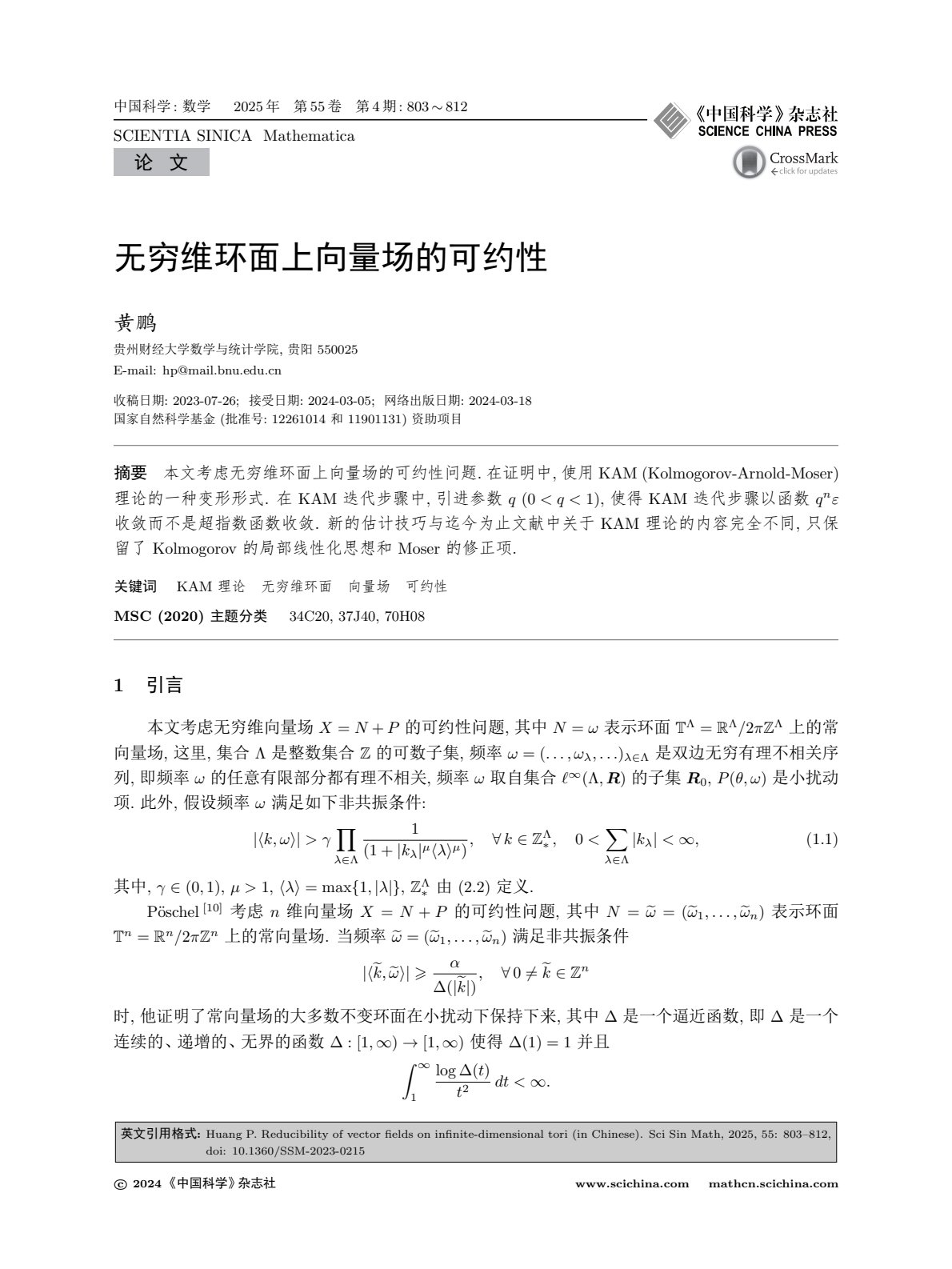 近日,威廉希尔williamhill黄鹏副教授以威廉希尔为唯一通讯单位,在期刊《中国科学:数学》上发表了题为“无穷维环面上向量场的可约性”的研究论文。