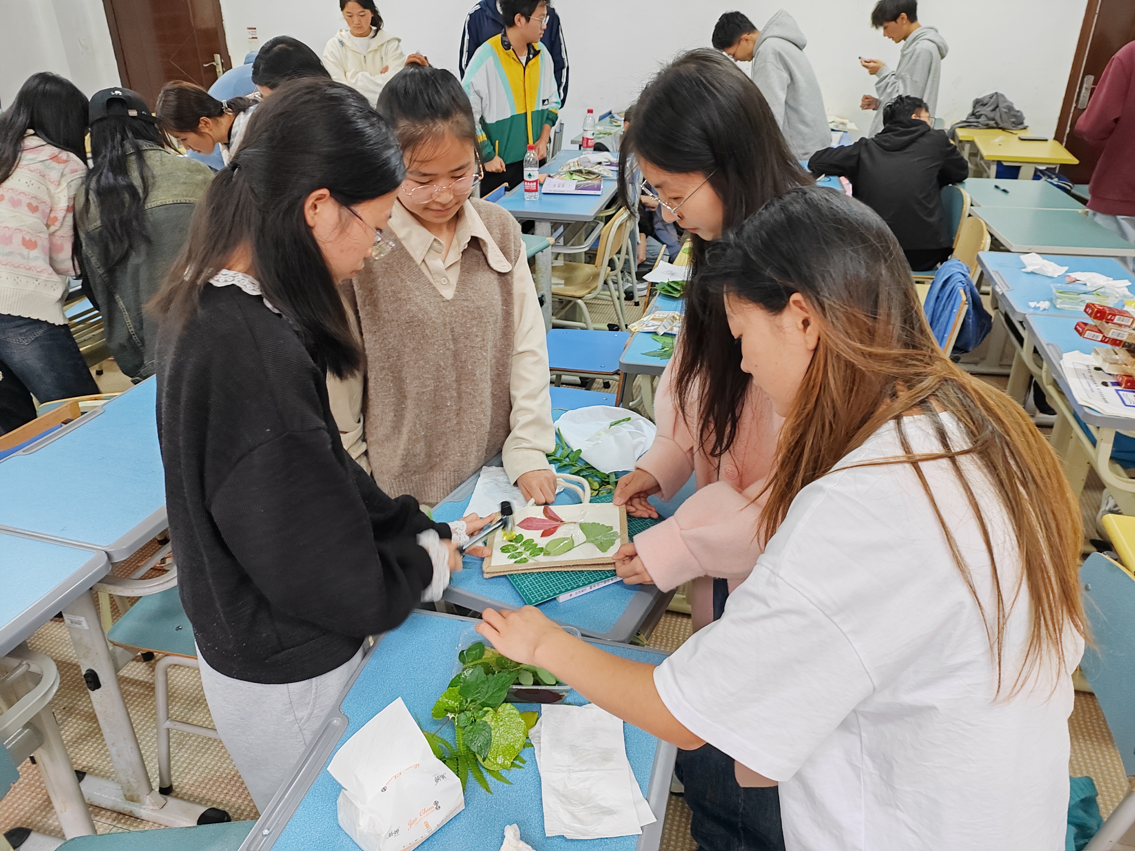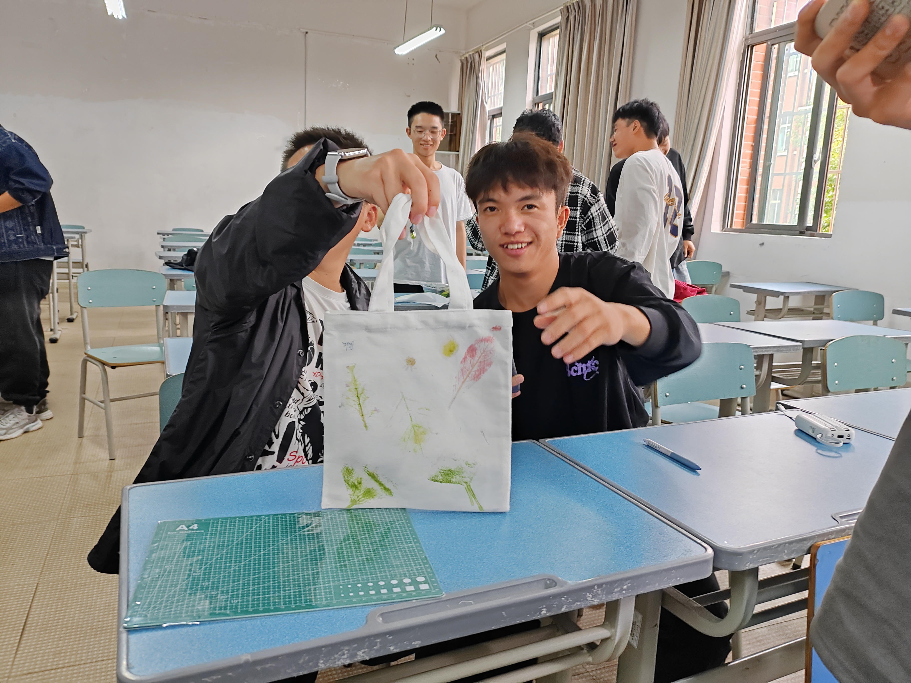 活动伊始,刘作志老师为同学介绍了拓印传统文化的历史渊源与传承,拓印是对雕刻的或石刻的表面的手工复制品,其方法是将一张纸紧紧覆盖在作品上,用黑色或彩色材料拓印,同学们制作拓印作品的材料可以多种多样。随后,同学们拿出自己精心准备的素材,开始了自己的创作,感受非遗魅力,体验劳动乐趣。