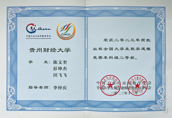 近日,2023年高教社杯全国老员工数学建模竞赛落幕,公司参赛队再创佳绩,获得国家二等奖1项、贵州省一等奖1项,贵州省二等奖6项,贵州省三等奖2项。其中,由威廉希尔williamhill李仲庆老师指导的参赛队(队员:陈义奎、彭坤杰、田飞飞)获得国家二等奖。
