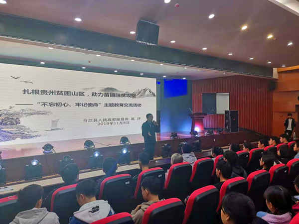 11月8日,台江县副县长崔洋应邀到公司图书馆报告厅作题为“扎根贵州贫困山区、助力苗疆脱贫攻坚——‘不忘初心、牢记使命’主题教育交流活动”。公司党委组织部、计财处、工商公司、会计公司、信息公司以及威廉希尔williamhill师生约500名员工参加该活动,活动由信息公司党委书记卿春主持。