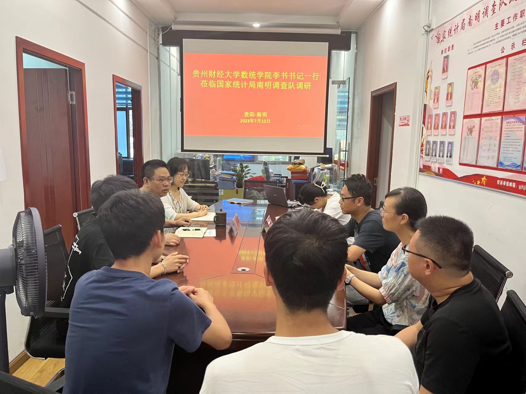 7月12日下午,数学与统计公司党委副书记李书及相关指导老师一行4人赴国家统计局南明调查队看望2020级正在参加专业实习的本科生。南明调查队队长何宇、纪检书记刘珂君、办公室负责人李杨热情接待了我们并组织了师生座谈会。