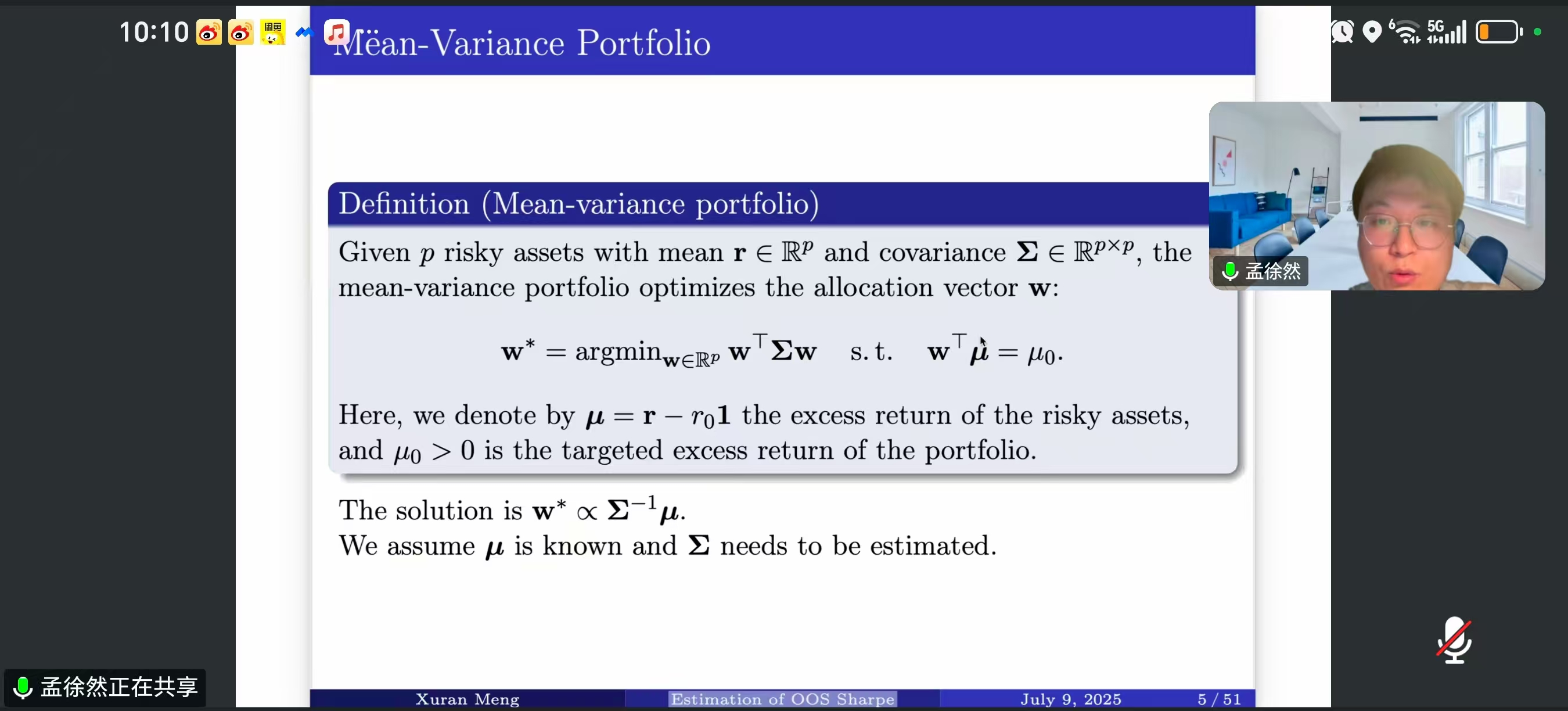 孟徐然以“高维投资组合优化的样本外夏普率估计”为主题,介绍了一种基于随机矩阵理论的方法,能够仅依赖样本内数据来估计样本外的夏普比率。在 Markowitz 均值-方差投资组合优化的框架下,研究了高维设定 p/n→ c,c∈(0,∞)的情形,通过正则化样本协方差矩阵,提出了夏普比率的一致估计量。此外,可将方法推广用于构建全局最小方差投资组合,以及修正样本外的有效前沿。