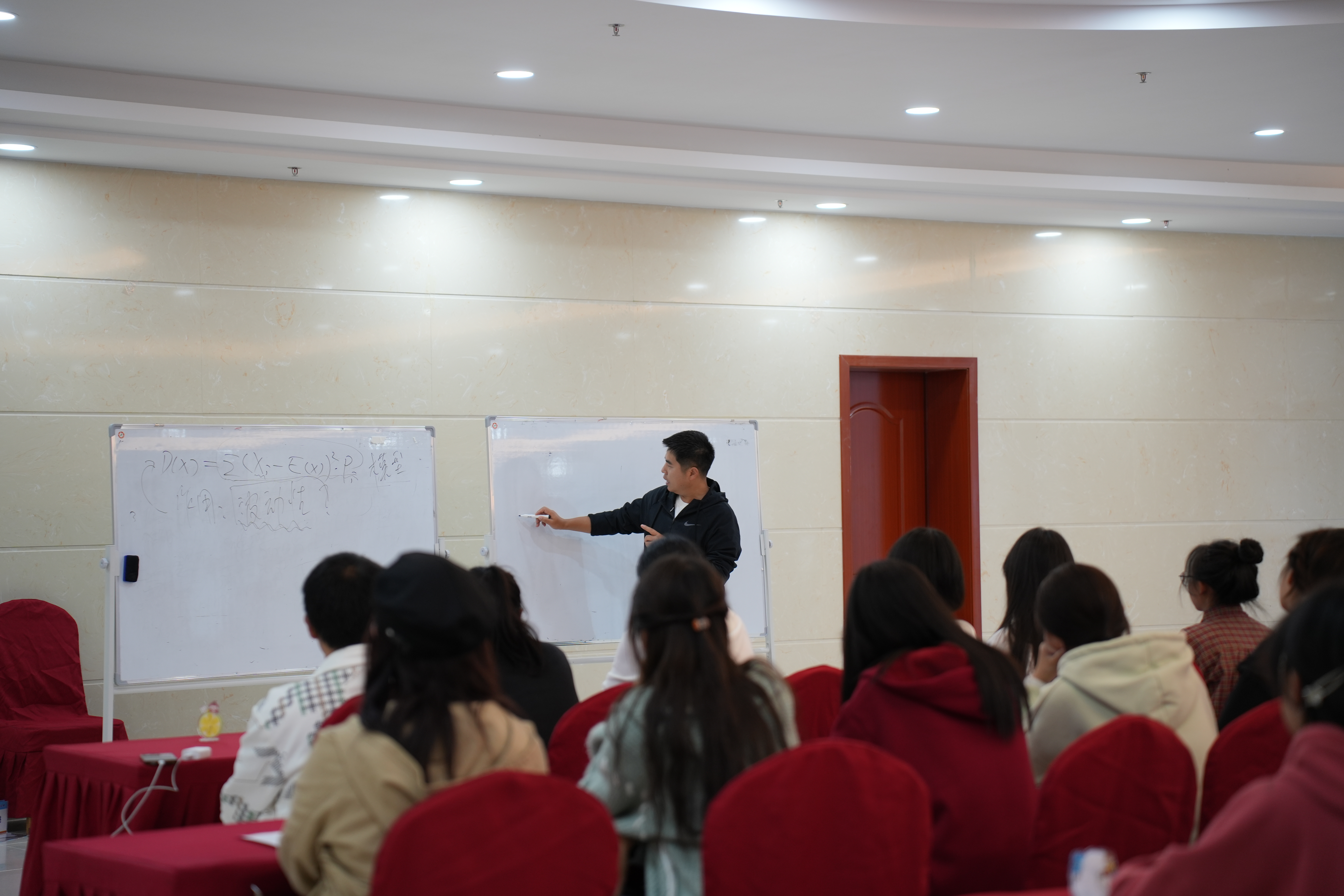 活动一开始周林勇老师就给大家阐述数学建模的思想,因为方差和相关系数是中学就已经接触但只是浅显了解的知识,所以这也让我们有更多的机会深入认识理解方差和相关系数。同学们认真听讲,紧跟老师的节奏和思路,老师通过白板的书写以及画图也让员工更容易去了解和学习新知识,解题思路和技巧。本次课程经过老师的独特思路和方式让同学们换个角度学习方差和相关系数,能根据方法做到了举一反三。